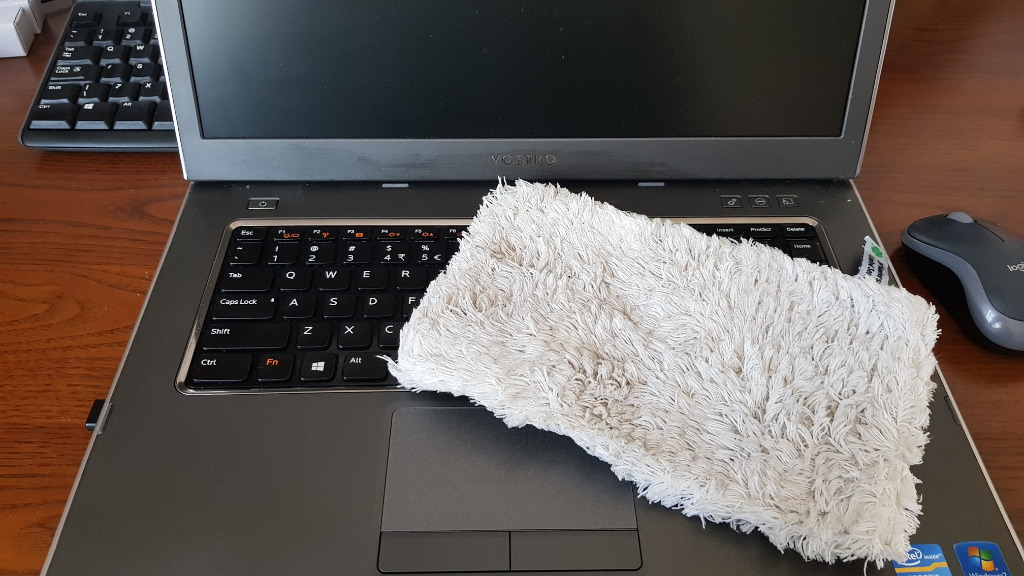 Jako pierwszej używam białej rękawicy, lekko wilgotnej (woda nie może z niej kapać), która, poza tym że zbiera drobny kurz to jeszcze czyści z tłustych osadów. Czyścimy nią dokładnie wszystkie płaskie powierzchnie oraz klawisze. Pamiętajmy, że komputer lub klawiatura musza być wyłączone.