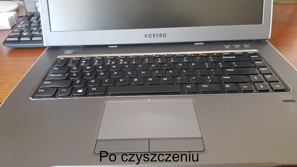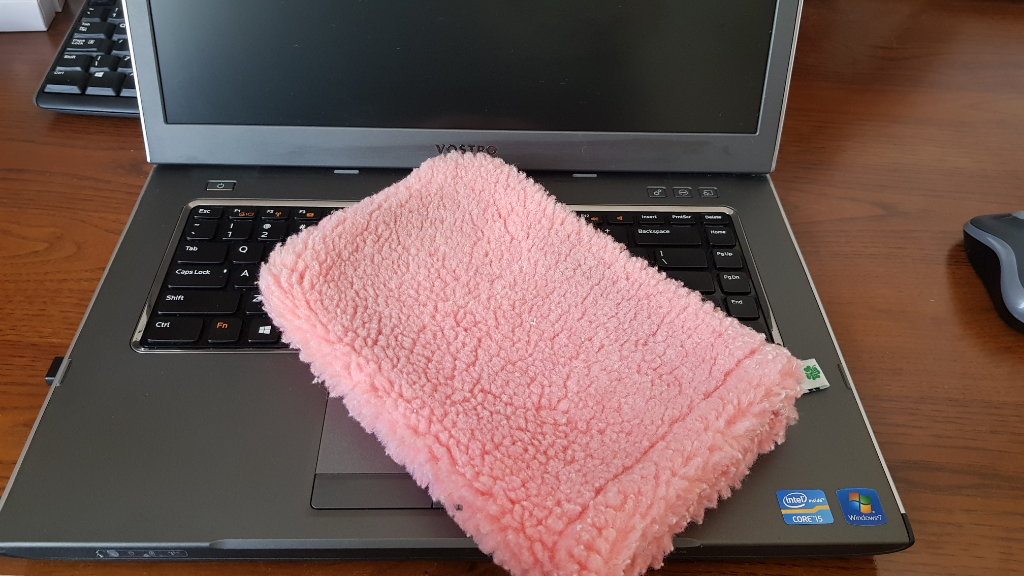 Po czyszczeniu na mokro przy pomocy niebieskiej ściereczki usuwamy brud i który pozostał z rękawicy i czyścimy do sucha. Ta ściereczka ma za zadanie zebranie wilgoci razem z rozpuszczonym brudem przez rękawicę białą. Wilgotną rękawicą czyścimy także ekran, matrycę oraz całą obudowę komputera, a potem do sucha niebieską ściereczką. Ściereczka ta też ma na celu usunięcie smug z matrycy. Pamiętajmy, aby nie wkładać w czyszczenie dużej siły, aby nie uszkodzić ekranu komputera.